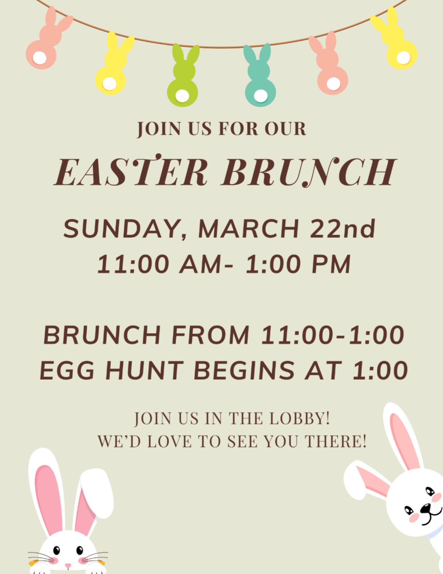 Join us in the lobby, and we’d love to see you there. Bring your appetite and your Easter spirit—we can’t wait to celebrate together!